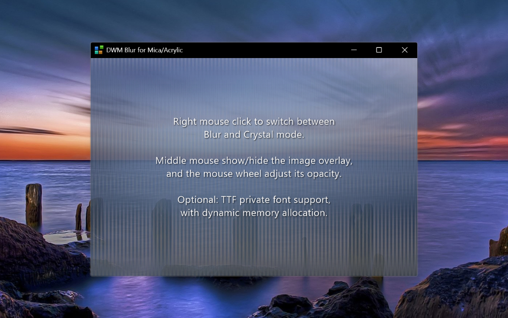 - True DWM blur toggle (Right-Click) with instant switch — no transition flash.